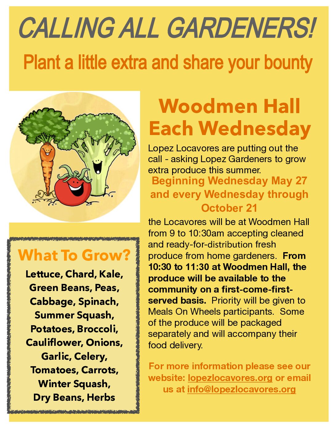 Grow a Row is a project for accepting and distributing your extra garden bounty. If you produce more than you can eat, or you are in a position of need, come see the Lopez Locavores Wednesdays, May 27th through October 21st 2026, at Woodmen Hall.